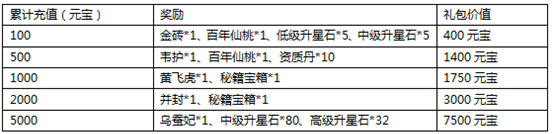 活动介绍:活动期间,玩家累计充值100元宝以上,即可获得价值400元宝以上的超值礼包,充值累计越多,所获取奖励越多!